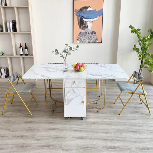 Movable Folding Dining Table with Storage Rack and 2 Drawers Extendable Versatile Kitchen Table and Metal Folding Dining Chairs